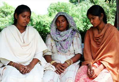 Relatives of the slain balmiki Srichand wait to see officials opposite the Meerut commissioner's office. From left, a daughter, Seema, 25; widow, Uma, 45, and another daughter Leena, 20.