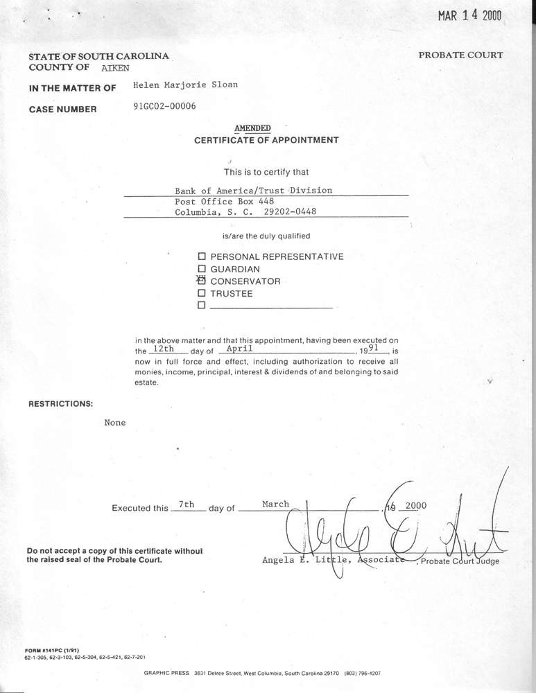 12. The hearings in the court below were lengthy. I have obtained tapes of the hearings and I would like to have time to transcribe them so as to establish a records for this appeal. A transcript will show easily that Creighton lied throughout his testimony. He changed his story on innumerable occasions. I cannot understand how Judge Hocker could so completely ignore this. Creighton also testified that the order appointing Bank of America as the conservator does not apply to Virginia. Creighton testified that he is the conservator in Virginia, but this is another lie. Also, the files of the Aiken County Probate Court contain numerous documents which Creighton Sloan signed as the conservator. His lawyer tried to get around this by claiming that the courts had run out of forms to be filed as the guardian and so, because of the shortage of paper, Creighton had signed a form for the conservator whereas he was really the guardian.