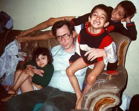 Michael is lying on the back of the couch. Anusha is in her father's lap. George is hanging off the side. Ismail Sloan with his children, Anusha, George and Michael in April, 1996.
