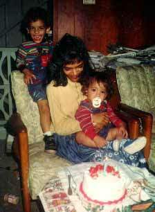Dayawathie Pedigedera Rankoth seated with Michael Rankoth Sloan standing left and George Rankoth Sloan in her lap. The occasion was the first birthday party for George.