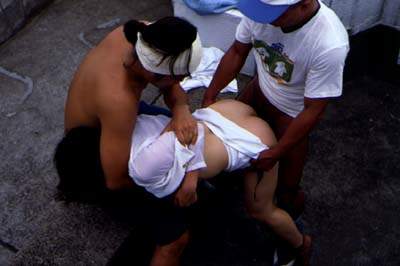 This fake photo supposedly depicts a Chinese women being raped during the May 13-15, 1998 riots in Indonesia which brought down President Suharto on May 21. Compare this with the next photo, which was posted on the "Sexy Asian Schoolgirls" site on December 4, 1997. Note the tape on the woman's breast. | This photo was posted on the "Sexy Asian Schoolgirls" site on December 4, 1997. Can you detect any similarity to the previous photo which supposedly depicts a Chinese women being raped during the May 13-15, 1998 riots? Note that there is no tape on the woman's breast. |