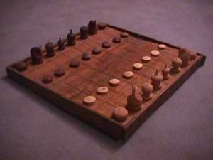 The pieces are set up the same as in International chess, except that the pawns start on the third rank and the king and queen on the white side are reversed, so that a king faces his opponent's enemy queen. This means that the two queens, which move diagonally only, can eventually capture each other.
