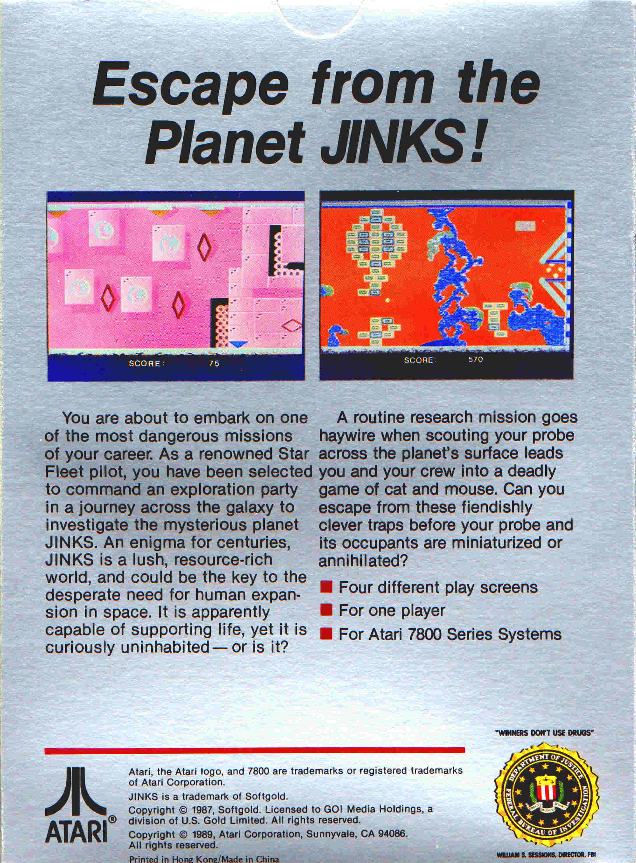 Asteroids, Barn Blaster (Can also be used with Best or Atari Light Guns), Desert Falcon, Galaga, Hat Trick (Ice Hockey Game), Jinks, Karateka, Ms Pac Man, Robotron 2084, Tower Toppler, Xevious and Winter Games $15 ea. Dig Dug, Donkey Kong Jr, Meltdown (7800 Light Gun Game), Pole Position II, One on One $19.95 ea. Ballblazer, Crossbow (7800 Light Gun Game), Touch Down Football $25.00 Ace of Aces, Food Fight, Joust, Real Sports Baseball $29.95 ea. Dark Chambers $39.95 Fight Night $49.95