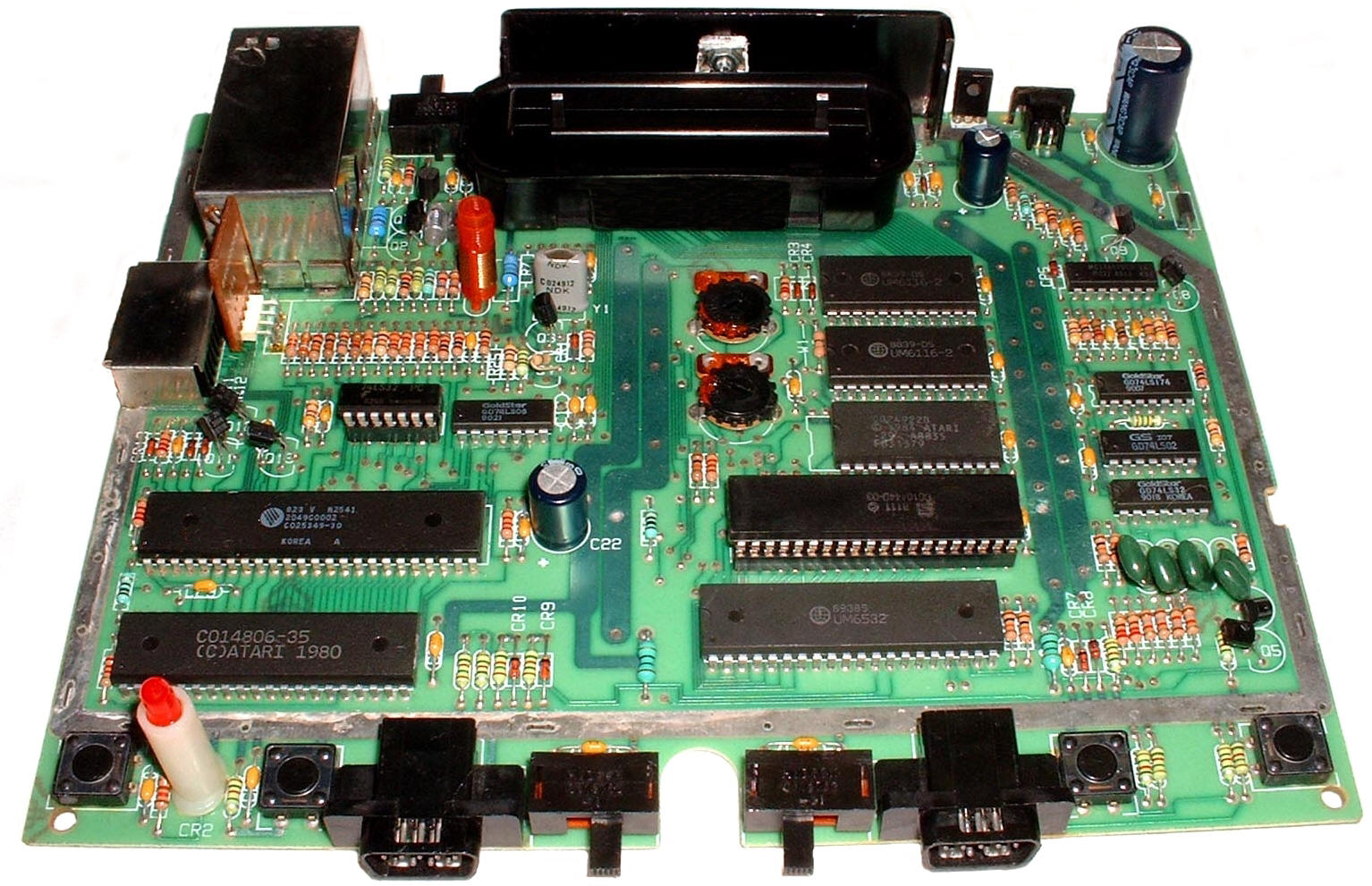 Best Atari 7800 Tech tip: If you are considering doing this 7800 Composite Video mod or Euro 7800 OS Upgrade, you should also consider ordering at least two new replacement 7800 On/Off and Game Start/Reset switches ($1.50 each). On all Atari 7800 consoles made, the 7800 switches have a Very high failure rate and should automatically be replaced if you go inside your 7800 console. The cheaper made switches used on most 7800 Motherboards are basically ticking time booms. Because of these poor designed push button switches, when the 7800 motherboards were wave soldered, all of the acids, rosins and chemicals (all heated to very high melting / flash points) used during the wave solder process (normally chemically washed off the bottom of the 7800 PCB boards in a down line wave solder process), leaked into each 7800 switch thru small openings in the bottom of the 7800 switches. With enough time (10 to 15 years after the 7800 motherboards were 1st produced) the all of the 7800 internal switch contacts have been damaged or corroded internally. An old Atari 7800 PCB switch may look new on the outside of the switch, but inside because of the left over chemicals and acids are just ticking time booms that will all 100% fail.