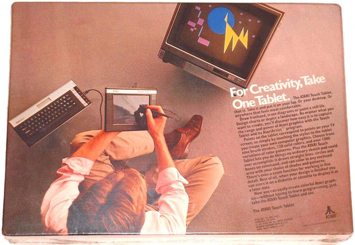 The Atari CX77 Touch Tablet is an Art and Graphics Controller that is plugged into a Joystick port and designed for use with the Atari 8 bit Computers (400, 800, 600XL, 800XL,1200XL, 65XE, 130XE and XE Game machine). You can Draw or Trace pictures with the CX77 Stylus, a pen or even your finger. You have your choice of 8 brush widths with 128 Computer Generated Colors with 8 brightness levels. Create Automatic Circles, Squares, Discs, Boxes, draw perfect Circles, Squares, Rays and Straight lines, draw a series of Connected Straight lines, Mirror Images, Fill objects, Erase objects, Magnify to eight times normal size any portion of your Atari Touch Tablet Drawings. Pictures drawn on your Atari CX77 Touch Tablet can be saved to an Atari Cassette or Atari 810, 1050 or XF551 Disk Drive. You can also load The Popular Micro Illustrator Program drawn Pictures on the CX77 Touch.