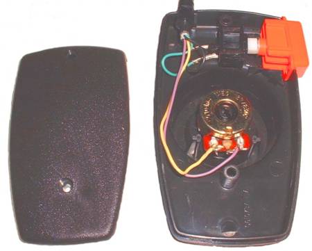 2. Hold the sides of the Paddle front case half and carefully and slowly lift / remove the back Paddle case(s) off. Note how the Orange fire button is attached to the Paddle switch and how the Paddle switch (with wires) is installed / oriented behind the paddle orange fire button. Please note, it is possible to reinstall the paddle switch (behind the fire button) in 4 different positions / rotations 0, 90, 180, 270 degrees / directions within the top case half. Since this CX30 Paddle switch assembly with orange fire button, floats (nothing holds down) between the front and back case halves (and can fall out of the paddle cases as you are replacing the Paddle Pots), it is best to note how the Paddle switch back end with the two wires is located over a small aligning notch / tab in the front case that sits between the two Paddle switch wires before you remove any Paddle Pots. Sometimes if the black Paddle switch(s) are not installed back to stock original direction / orientation, you will find the Paddle buttons will bind (when pressed) when you reassemble the Paddles case halves.