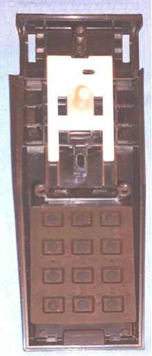 There are three male plastic aligning pins molded into bottom of the numeric keypad support plate and female receptacles on the bottom half of the CX52 bottom case. If you pull this support plate off at too steep of an angle from one side or the other, you will break off one of the three aligning pins on the flex circuit support plate.