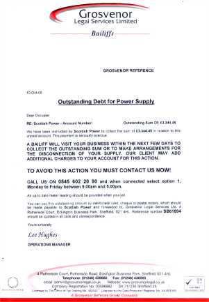 This letter is a typical example of a Company acting as Debt Collectors masquerading as Bailiffs. They may well be Bailiffs but in this case they have no authority but to request an alleged debt. There has been no Court order given. We have written to : David Birkhead, Group Managing Director of Grosvenor Legal Services Limited, to explain his company's representation. We shall, of course, publish his response. Have you received such letters? They are: Grosvenor Legal Services Limited of 4 Rotherside Court, Rotherside Road, Eckington Business Park, Sheffield S21 4HL Licensed by the Data Protection Tegistrar No. X44081959- Licensed by the Office of Fair Trading No. 462645 ISO 9001 Registered firm. |